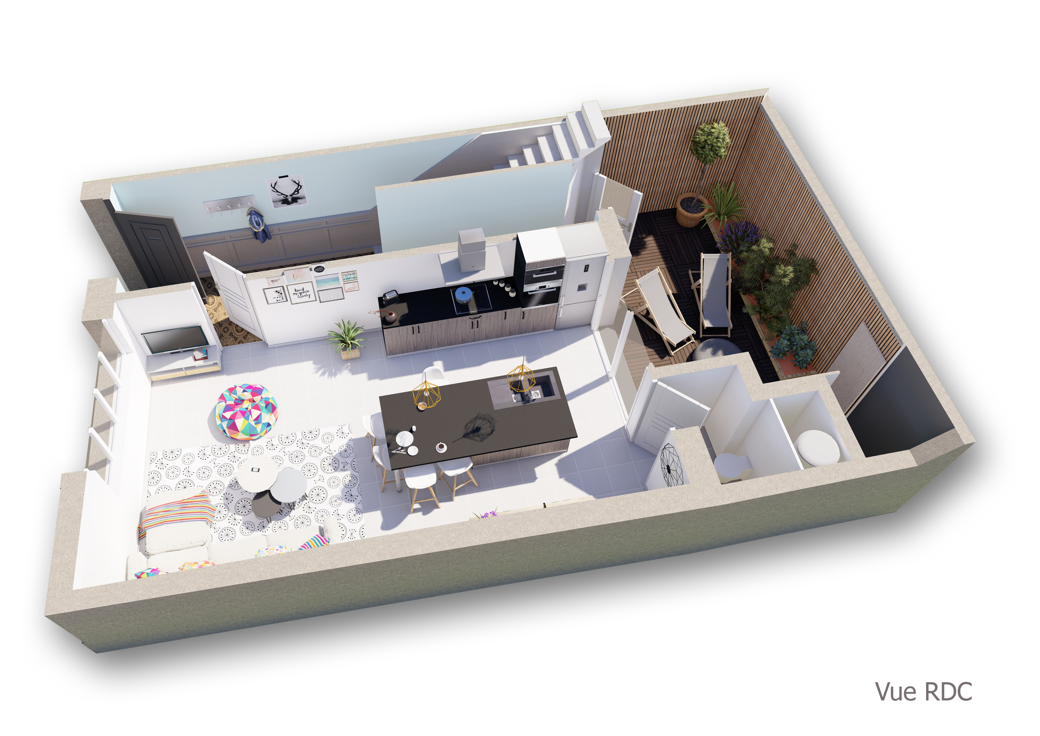 Axonométrie 3D Rez-de-chaussée / étage, + vue du séjour pour un projet de rénovation d’échoppe à Bordeaux. Un moyen très efficace pour se projeter dans l’ensemble du projet, ou déclencher la vente d’un bien avant travaux. Contactez nous pour plus d’infos ! Lire l'article